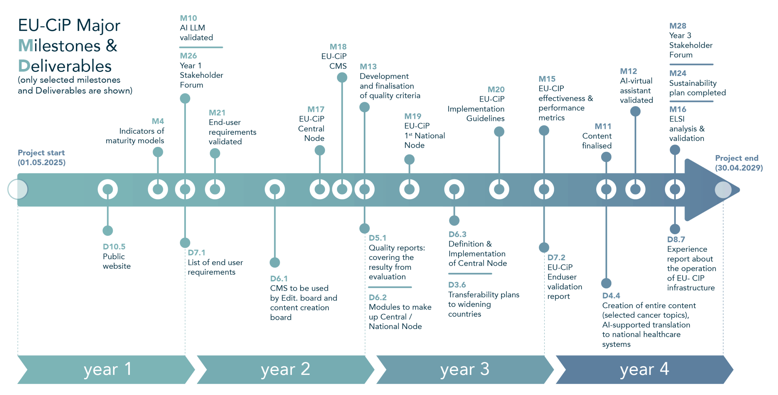 Below are the milestones of the EU-CiP project. They represent key points of progress in delivering the cancer information portal with its library of content and launch of local portals.
