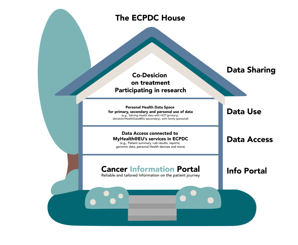 The Cancer Info Portals are part of a larger vision to support citizens dealing with Cancer. ECPDC is short for “European Cancer Patient Digital Center” and the ECPDC house visualises this strategy as a building with multiple stories that represent different services and levels of engagement for the patients. The Cancer Info Portals, built in the EU-CiP project are a fundamental first step.