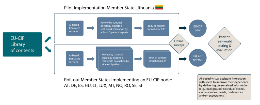 The EU-CiP pilot will be conducted in Lithuania where the first Cancer Information Portal prototype will be established. It will consist of a pilot website which includes a good practice navigational structure and design to illustrate the content in the local language. The roll-out partner will benefit from lessons learned, good practice implementation solutions, tools and templates for their implementing solution. In a second step, a consortium of experts from multiple European countries will collaborate to implement portals in various national languages, ensuring broad accessibility and relevance across the Union. The design and implementation steps will be supervised by patient experts to ensure that the components and contents meet the requirements and needs of the patients.