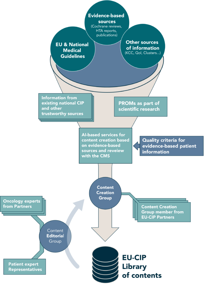 A comprehensive technical architecture for the EU-CIP will include a common Library of Content. This library will contain guideline-based information to be used and iterated by the Member States to match the information provided with their national and regional health care systems. Content generation is facilitated and managed by a suited Content Management System. This way, efforts by Member States and their participating partners can be reduced due to synergies in a co-creation process for the content.